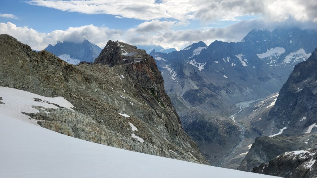 – Option sportive : Pour les alpinistes en quête d’un défi supplémentaire, il est possible de passer par le Col de l’Évêque (3 392 m). Cette variante implique une montée supplémentaire suivie d’une descente technique vers le Haut Glacier d’Arolla avant de rejoindre le village.