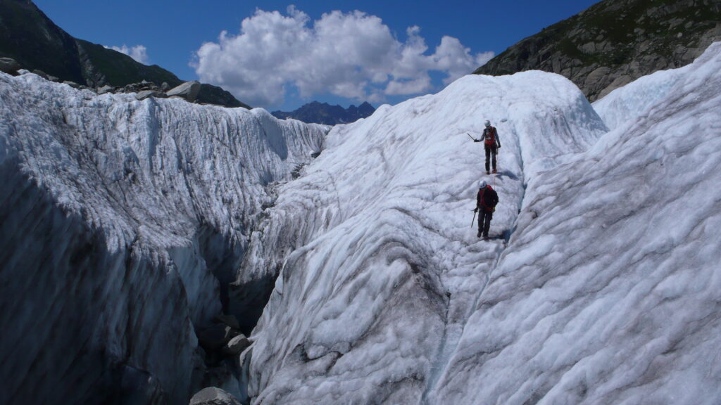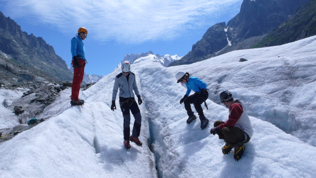 Univers glaciaire fascinant : observation de bédières, moulins, moraines, séracs… les reliefs spectaculaires du glacier à portée de main.