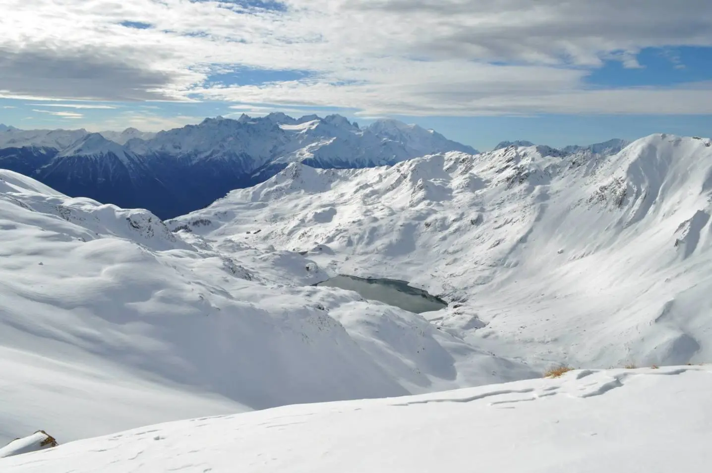 Combes larges, pentes soutenues, vues spectaculaires sur le Mont Blanc et le lac.
