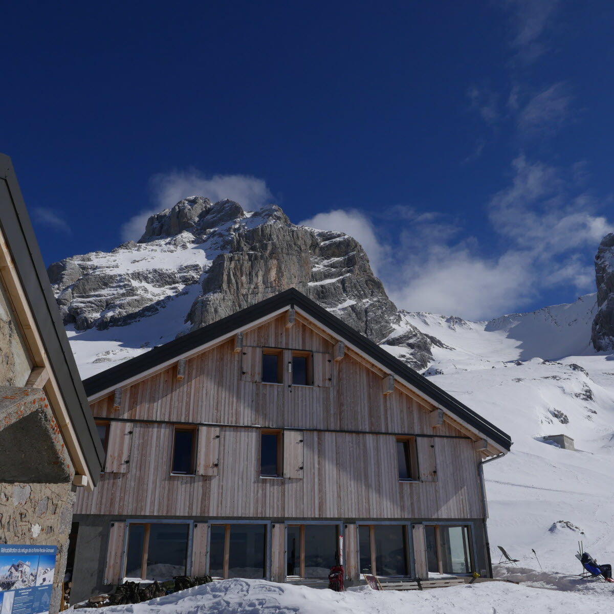 La cabane est un refuge gardé et spacieux (environ 34 places, dortoirs et chambres confortables), offrant un cadre chaleureux même en plein hiver. Sa grande salle à manger panoramique est orientée vers le massif, créant une ambiance unique et conviviale après la journée de ski.